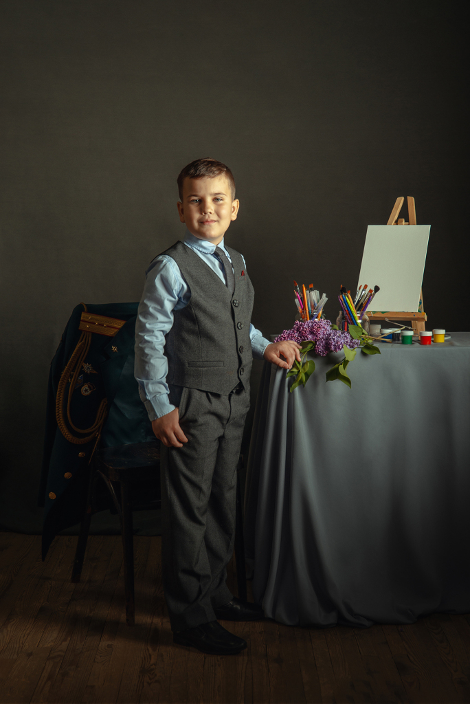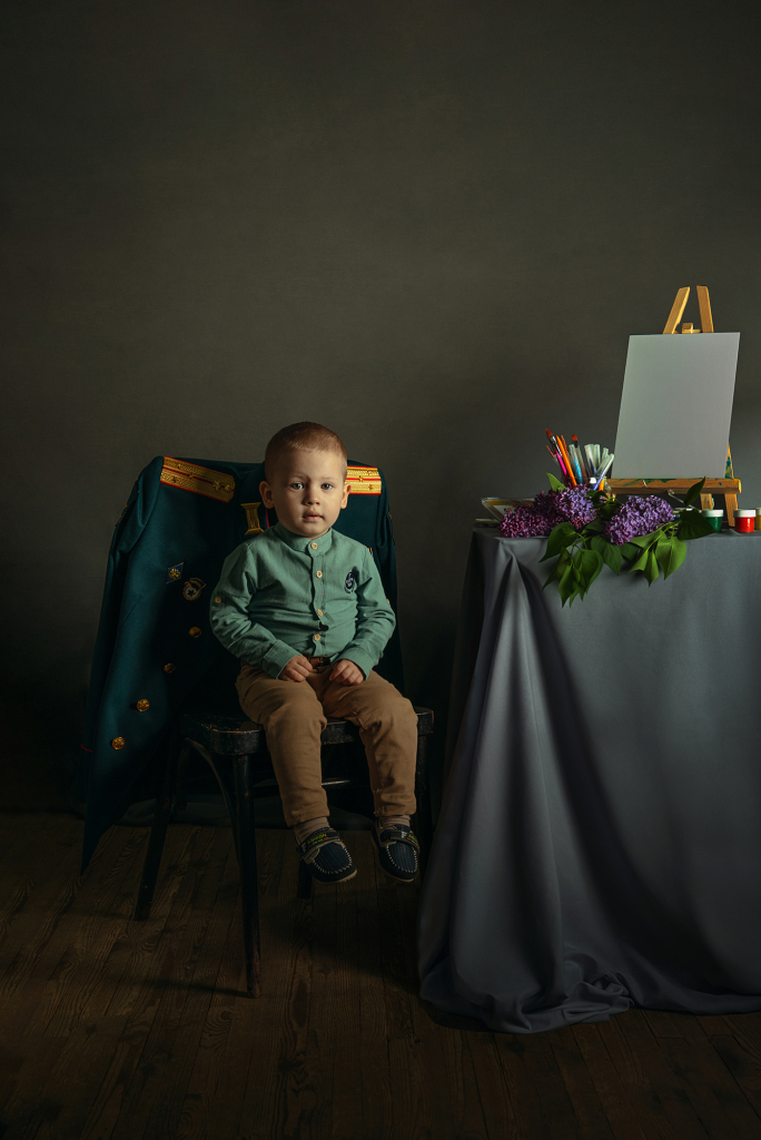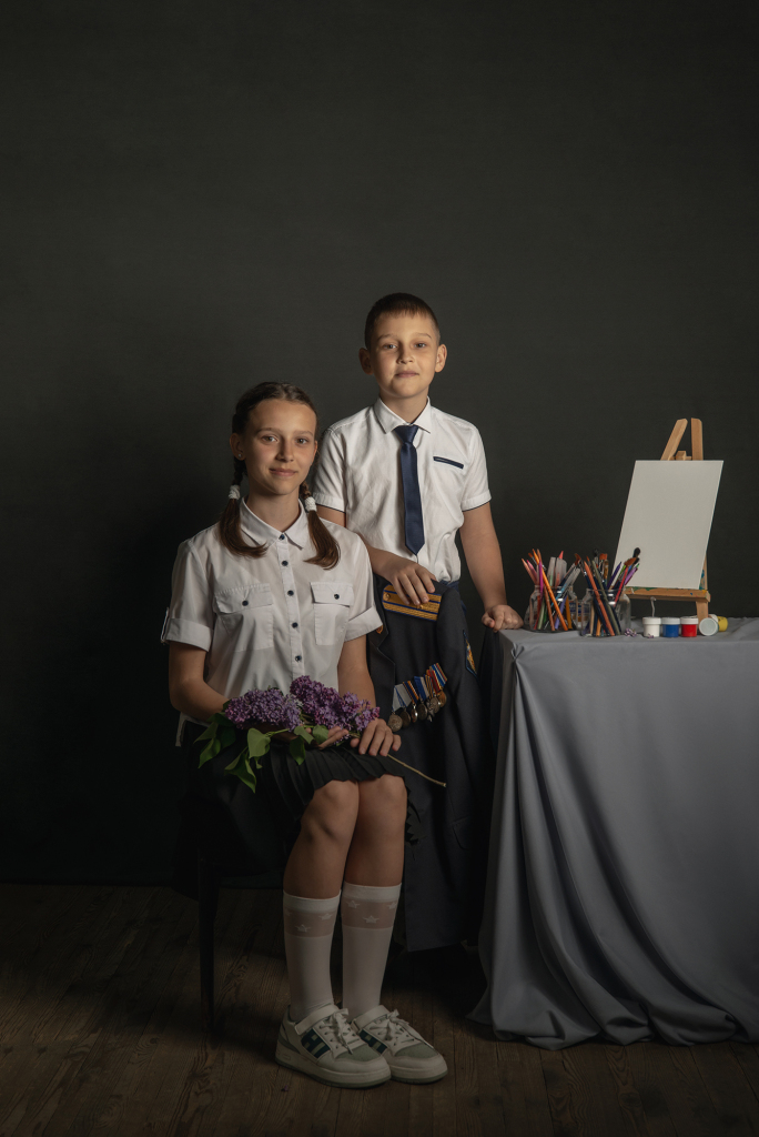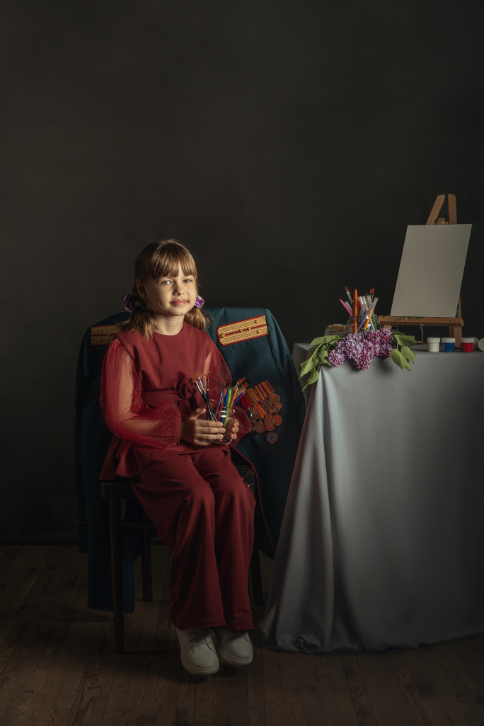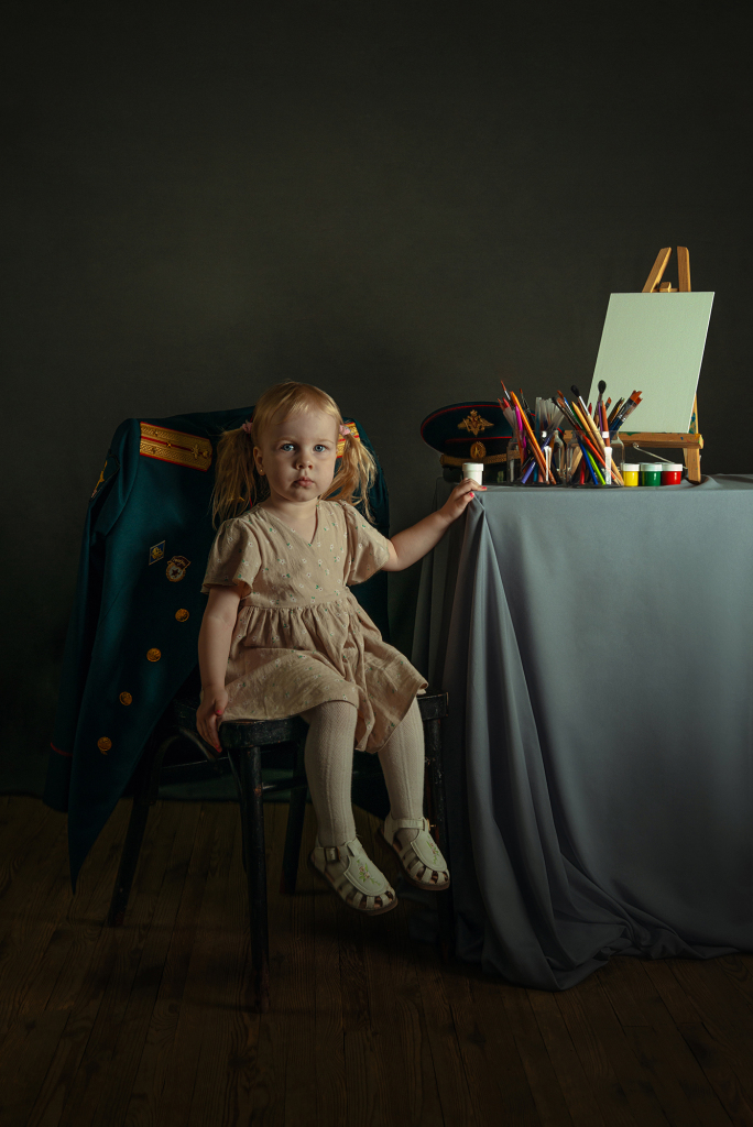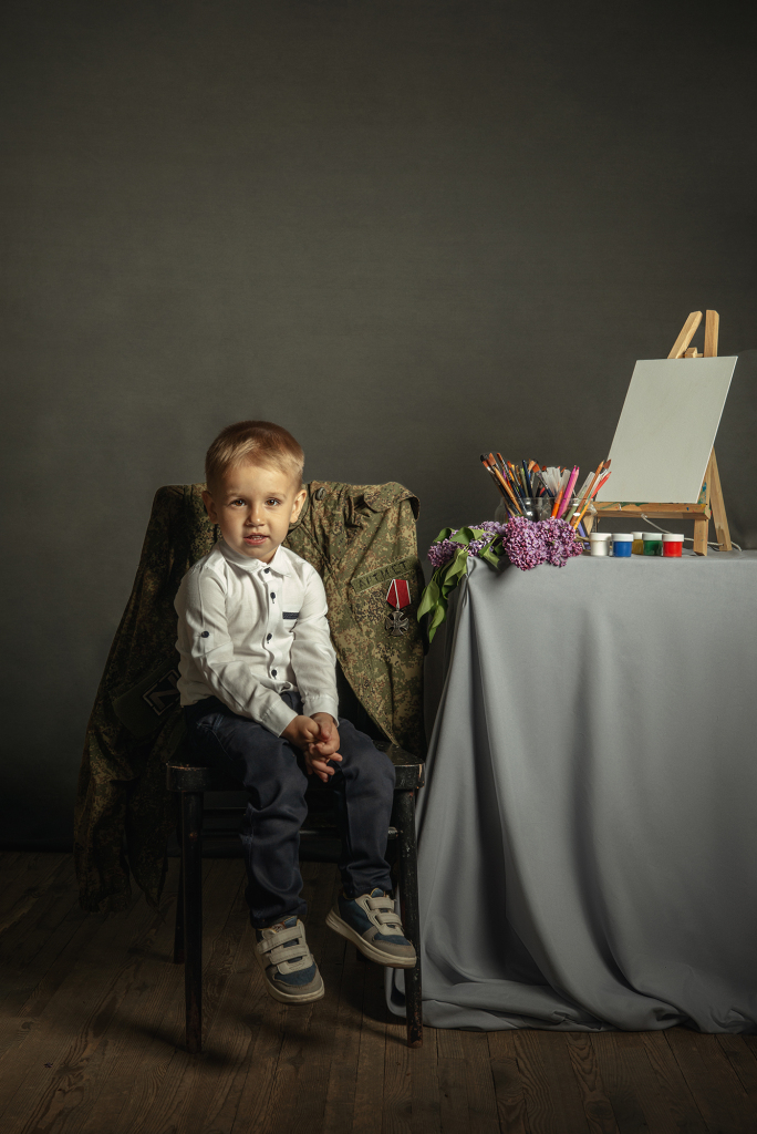 Снимок входит в авторский проект "Папа, я тебя жду!", посвящённый детям героев СВО. Количество участников около 100 человек на данный момент. На стуле за каждый ребенком расположен китель его отца с орденами и медалями. Папа - опора, он всегда за спиной, всегда защитит, обнимет, он любит безусловно. И китель - его постоянное присутствие рядом. Это история про связь поколений, про то, что за нами всегда стоят наши родители, на ними - их родители и так далее. И всегда следует помнить о силе и опыте своего рода. Белый холст в кадре символизирует само детство. Дети приходят в этот мир с чистым разумом и сердцем. И именно мы, взрослые, формируем семейные ценности, устои, целый мир для ребенка. От нас зависит будущее наших детей. Ведь нет у Бога других рук кроме человеческих. Место съемки г. Аксай Ростовской области, дата съемки 20.04.2024