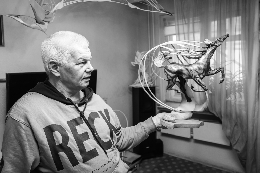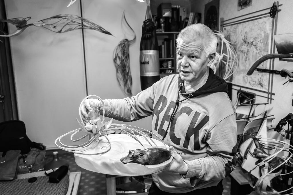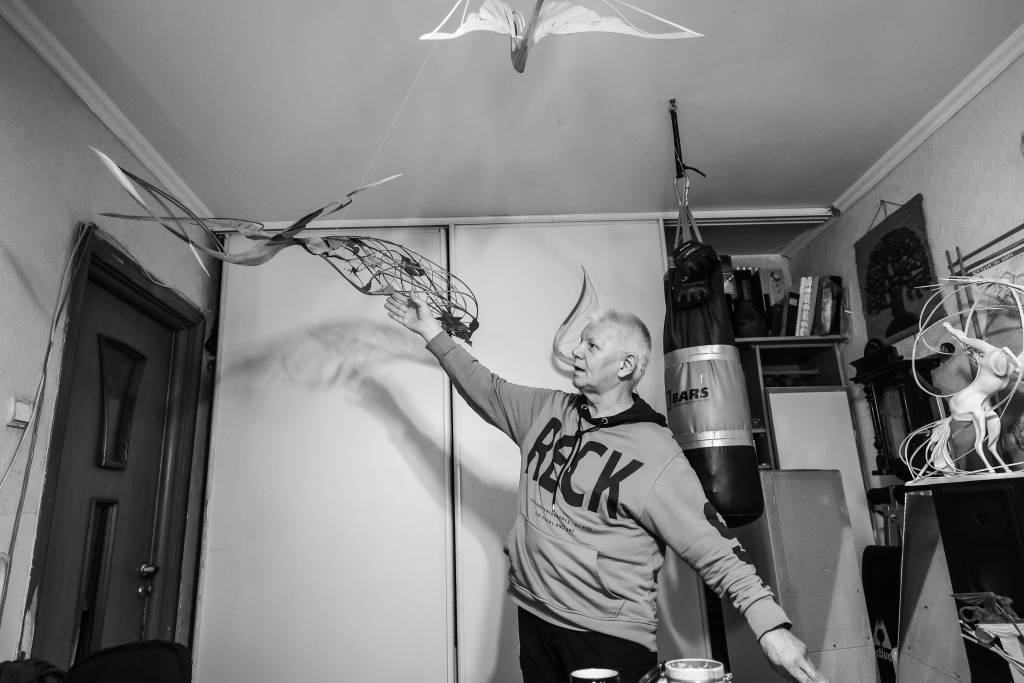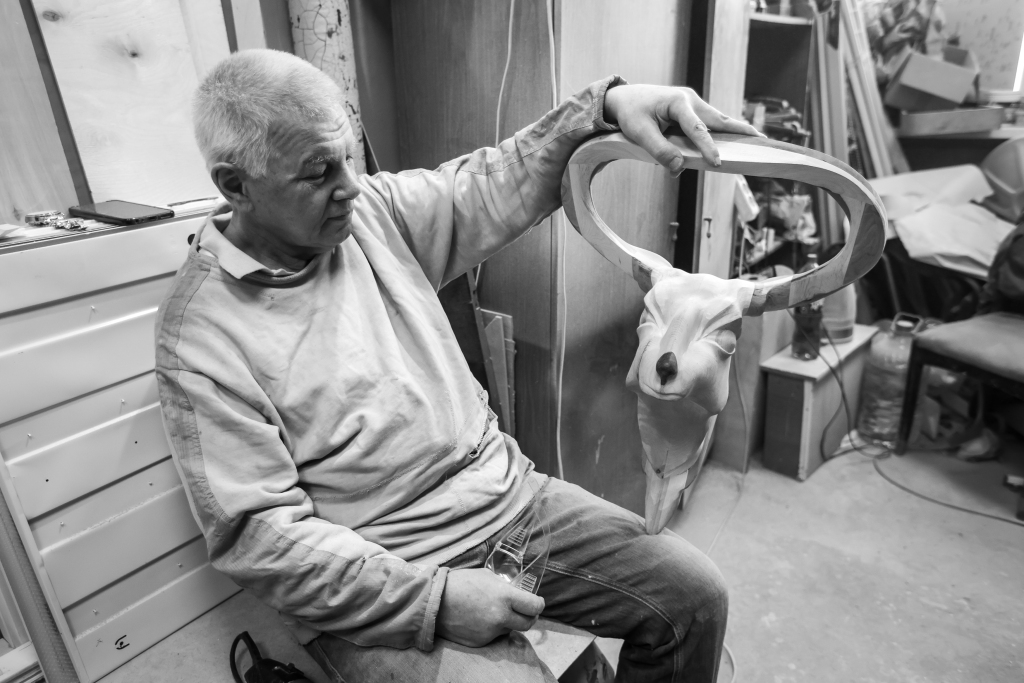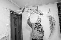 Евгений Котекин многие годы работает с деревом. Его столярные изделия зачастую оказываются уже по сути скульптурами, ремесло перерастает в искусство. Причем каждая работа, как правило, обладает не только утилитарными и декоративными свойствами, но также наполнена глубоким символическим смыслом и особой энергетикой. Например, традиционные русские птицы-обереги у Евгения становятся из плоскостных объемными и, как утверждает автор, созданы в созвучии с каждым заказчиком для гармонизации его личного пространства. Все фото сняты в 2025 году в мастерской и дома у художника.
